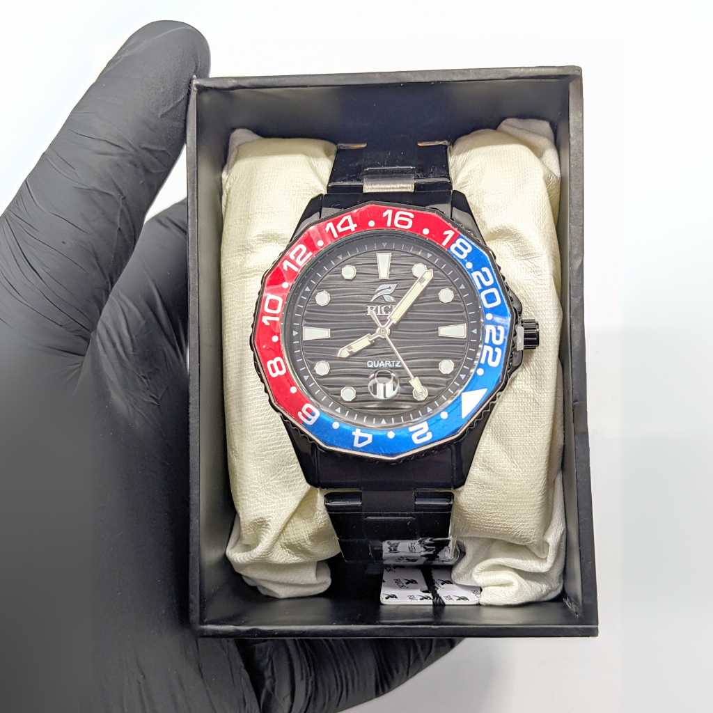 The Rick GMT Pepsi Edition showcases the iconic red-and-blue “Pepsi” bezel, designed for effortless 24-hour time tracking. Its bold black dial with luminous markers ensures clarity in all lighting conditions, while the sturdy black metal bracelet delivers a modern, sporty edge. Powered by precise quartz movement and equipped with a date display, this timepiece blends travel-friendly functionality with timeless style.