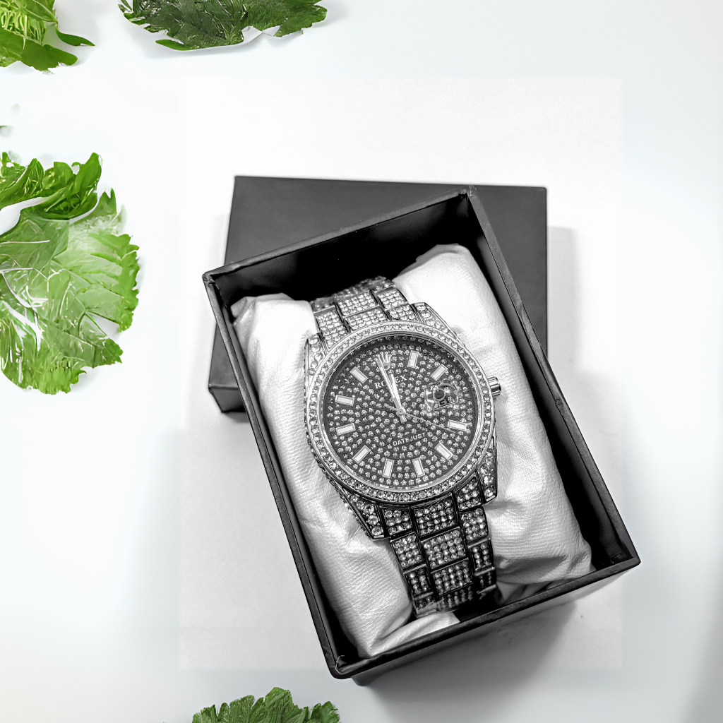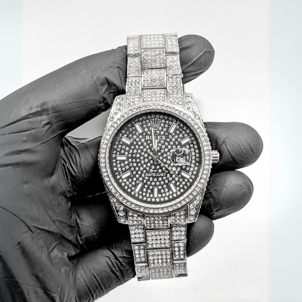 The Rolex Datejust Diamond Edition is a striking luxury timepiece, featuring a dazzling array of diamonds that cover both the bezel and bracelet, elevating its aesthetic to an unparalleled level of elegance and sophistication. The watch boasts a black dial, studded with diamonds and complemented by luminous hour markers. The iconic Datejust design, combined with the bold use of diamonds, makes this watch a perfect blend of timeless functionality and opulence. The piece is finished with a polished silver-tone bracelet, offering a stunning, high-end look suited for those who appreciate luxury.